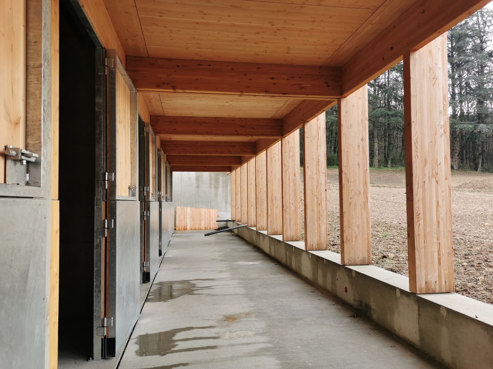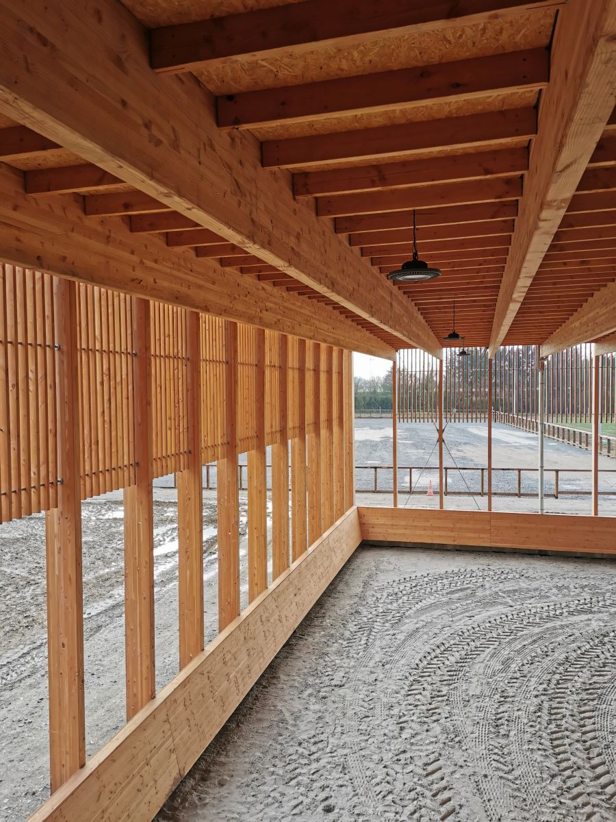 Le nouveau bâtiment s’articule sur deux niveaux. Un large rez-de-chaussée, en béton, permet de contenir la quasi-totalité du programme. Les structures de l’étage moins exposées mais avec des contraintes thermiques sont réalisées en ossature bois (bureaux, club house). Le projet respecte la topographie du site et s’inscrit dans la pente de manière à en minimiser l’impact visuel. Il permettra très prochainement d’accueillir 28 chevaux au box, un manège, une carrière, un club house, des vestiaires, une zone de stockage et un espace pour le personnel.