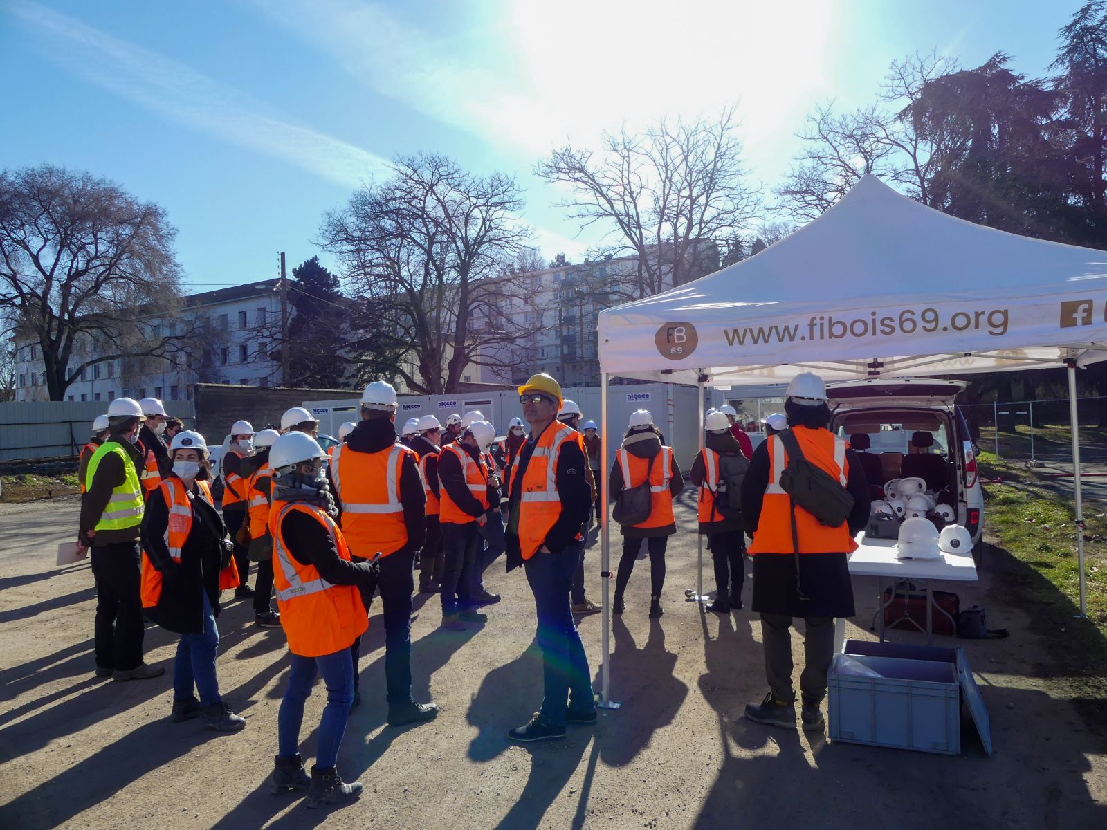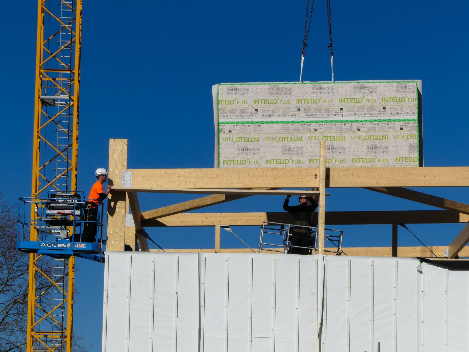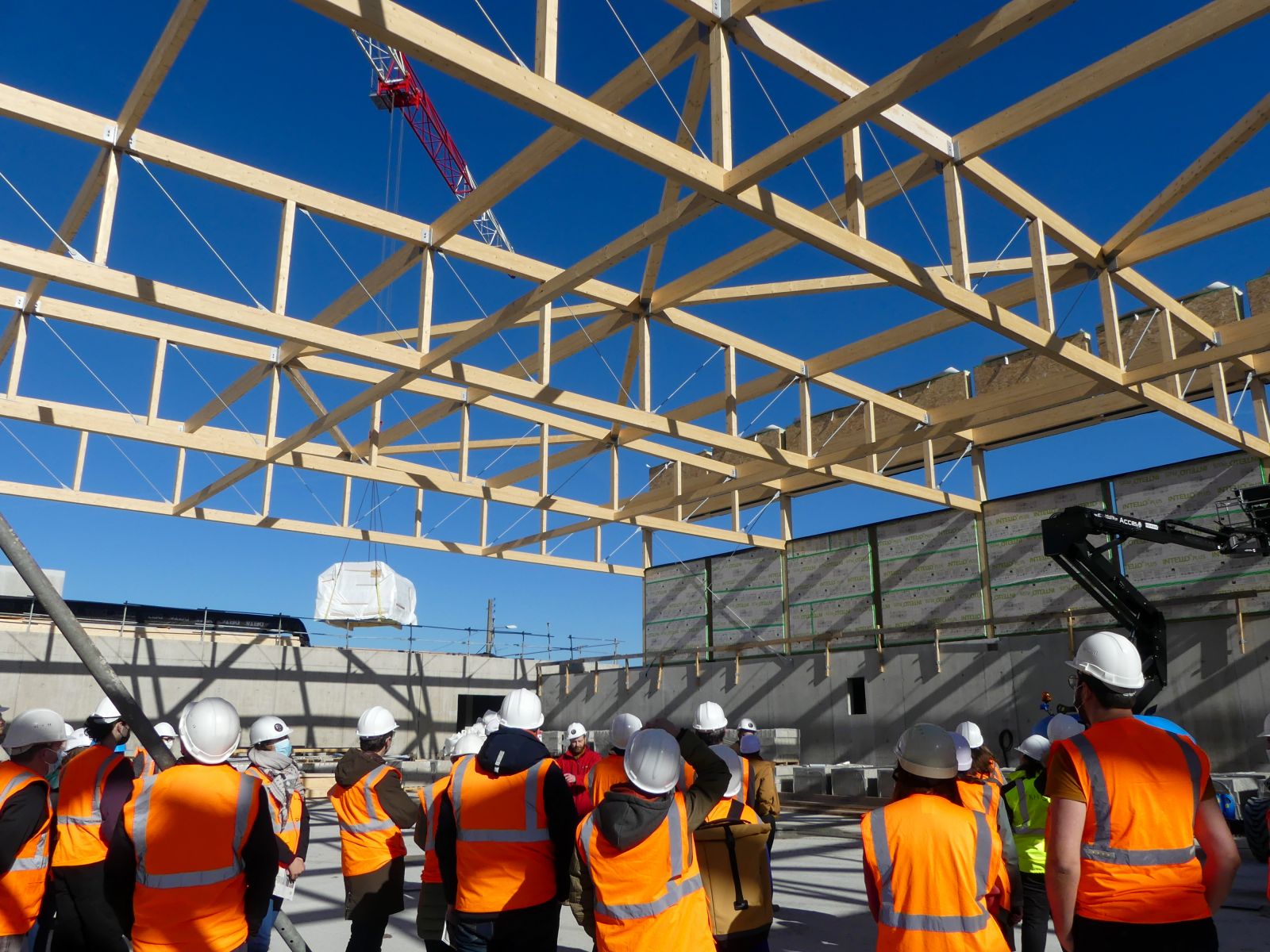 Fibois69 vous propose une visite de chantier en phase de levage d'un gymnase réalisé en ossature bois & isolation bottes de paille.